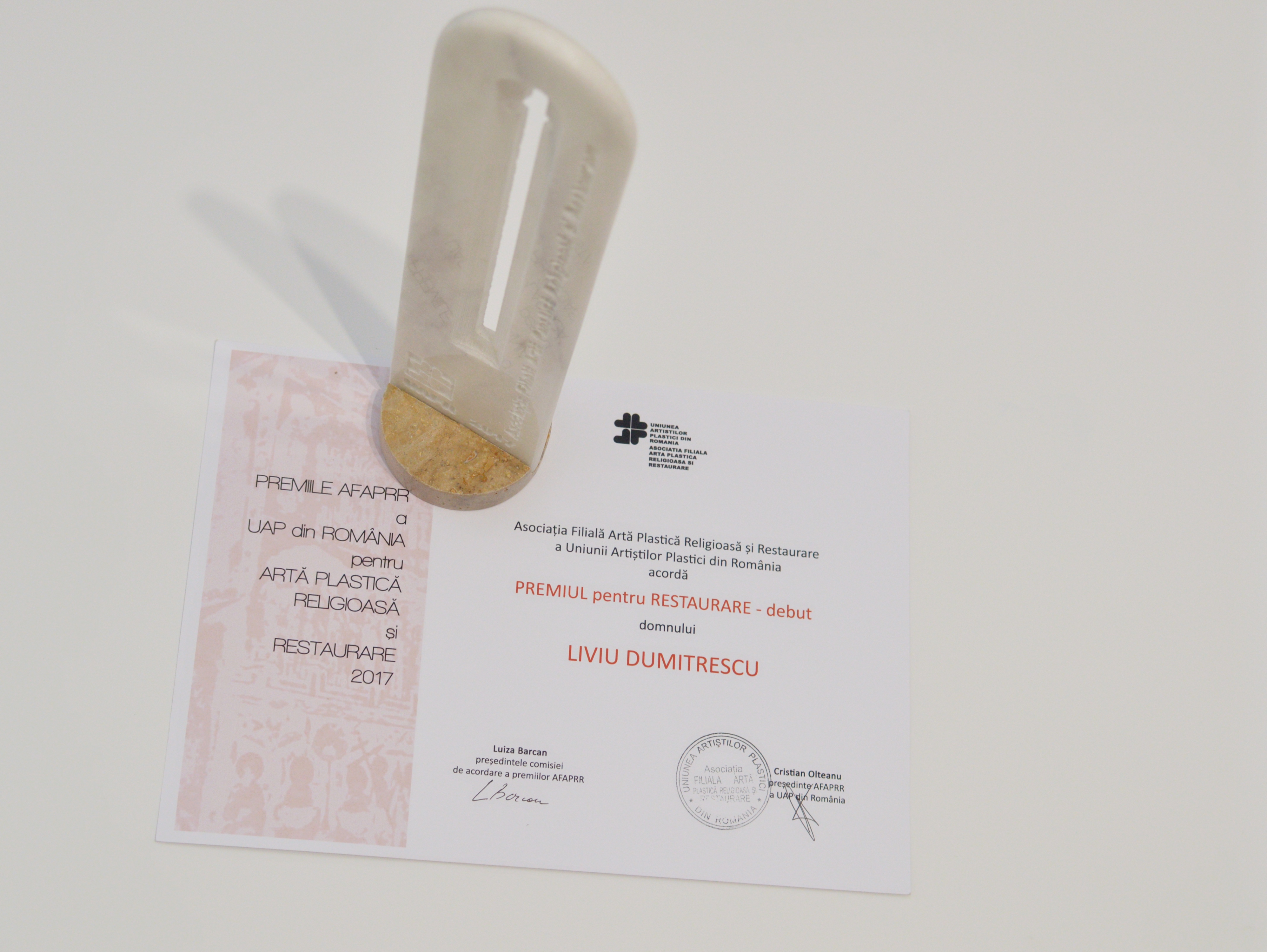 Trofeul a fost inmanat de Ana Dobjanschi(expert restaurator, istoric de arta), Presedintele de onoare al AFAPRR al UAP din Romania.