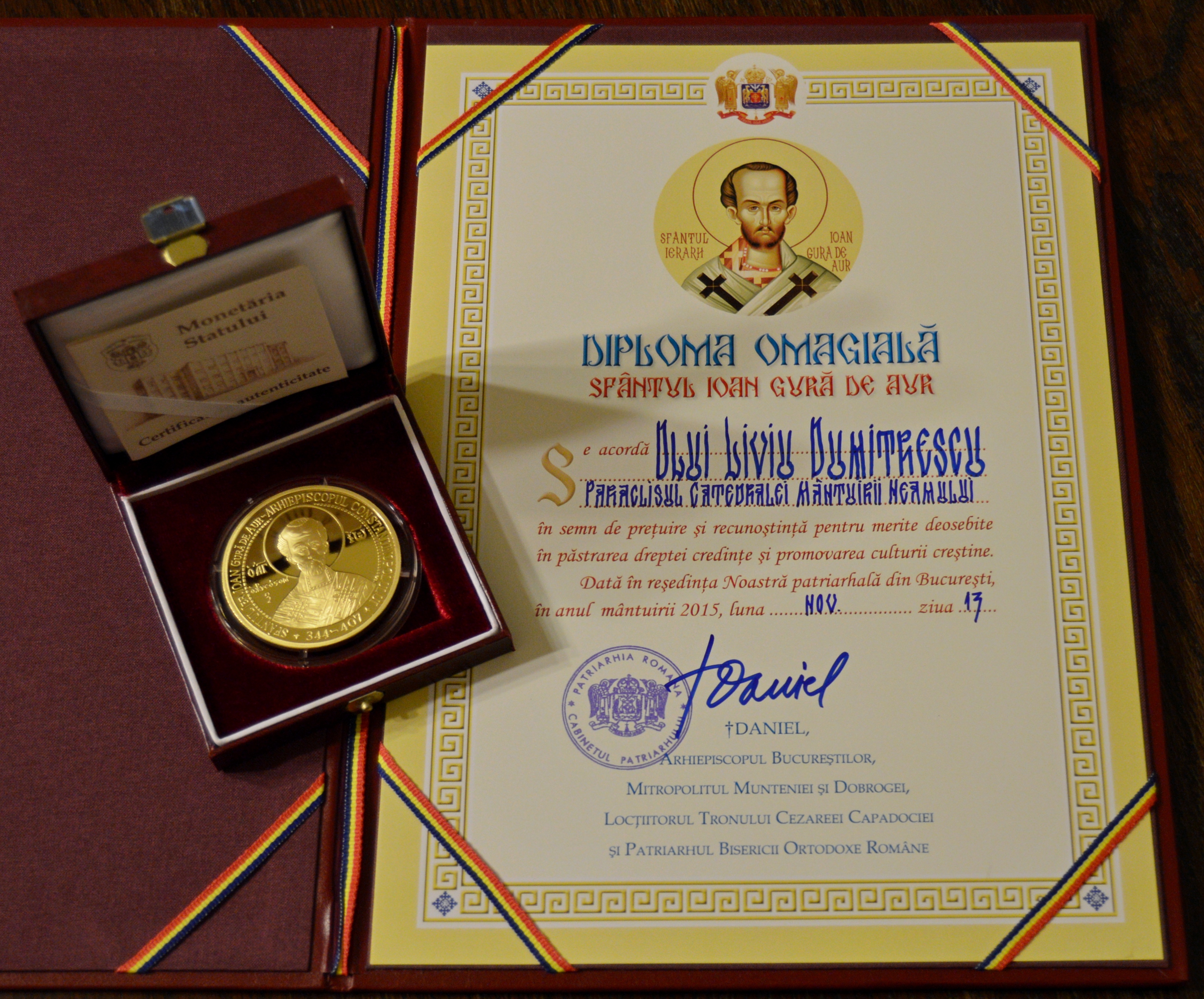 St. John Chrysostom Medal awarded by the Patriarch of Romania for painting church