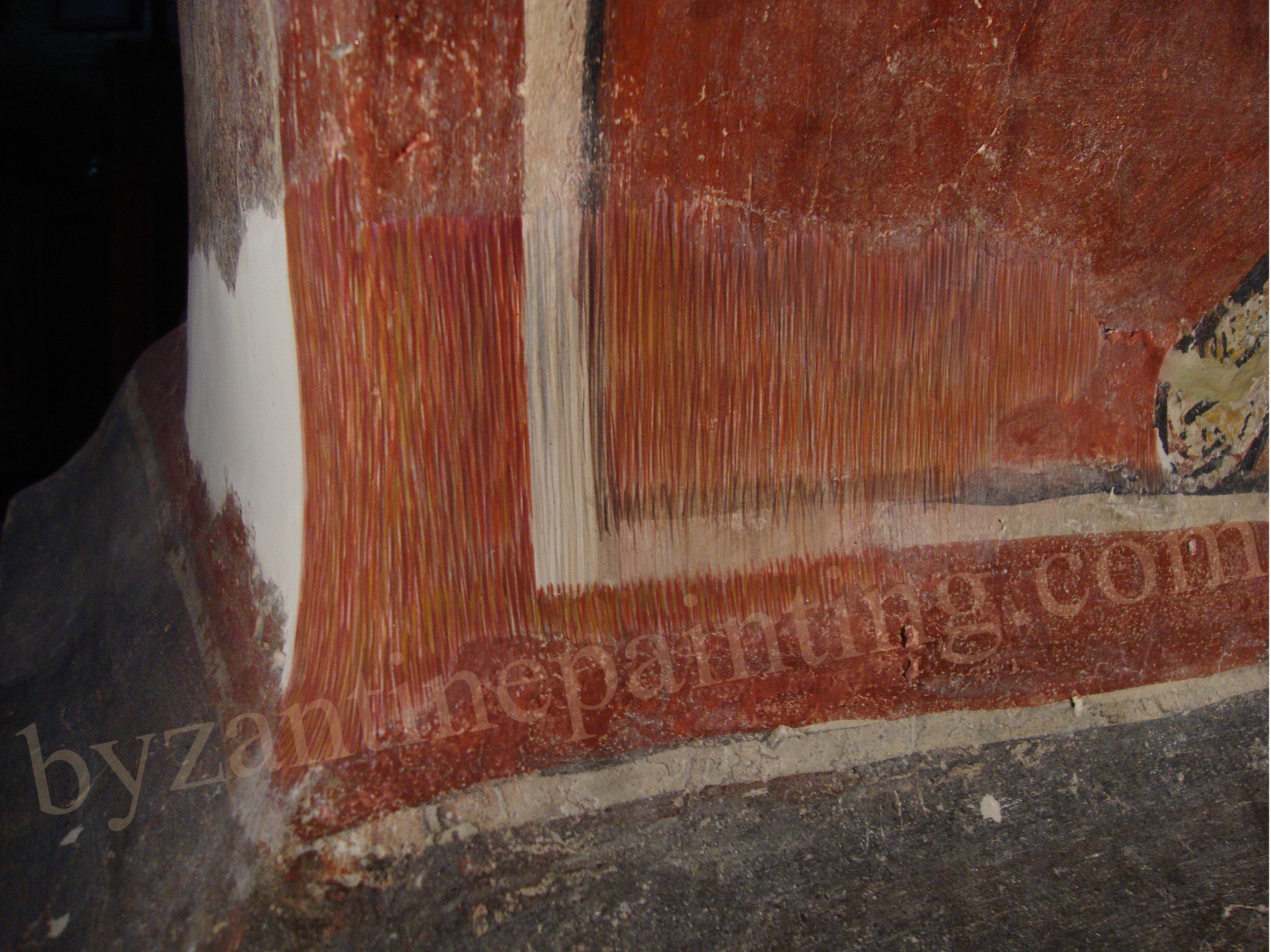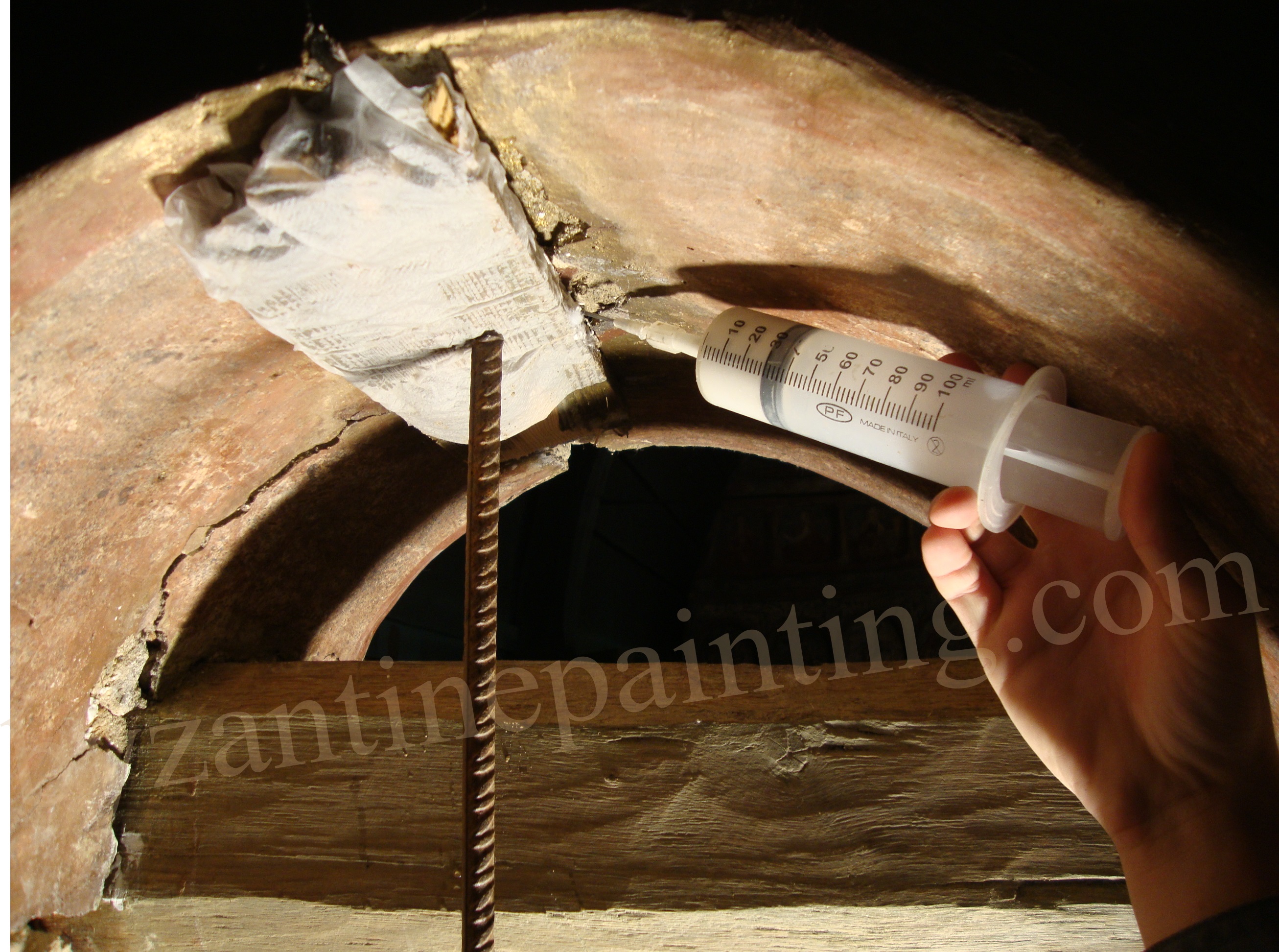 Cleaning the thick deposits of soot dust and tars. The operation is the most spectacular as, by the removal of these layers, witch alter the original image one passes from the soot covered and blackened surface, to a surprising chromatic range, or to zones with traces of the tehnological elements.