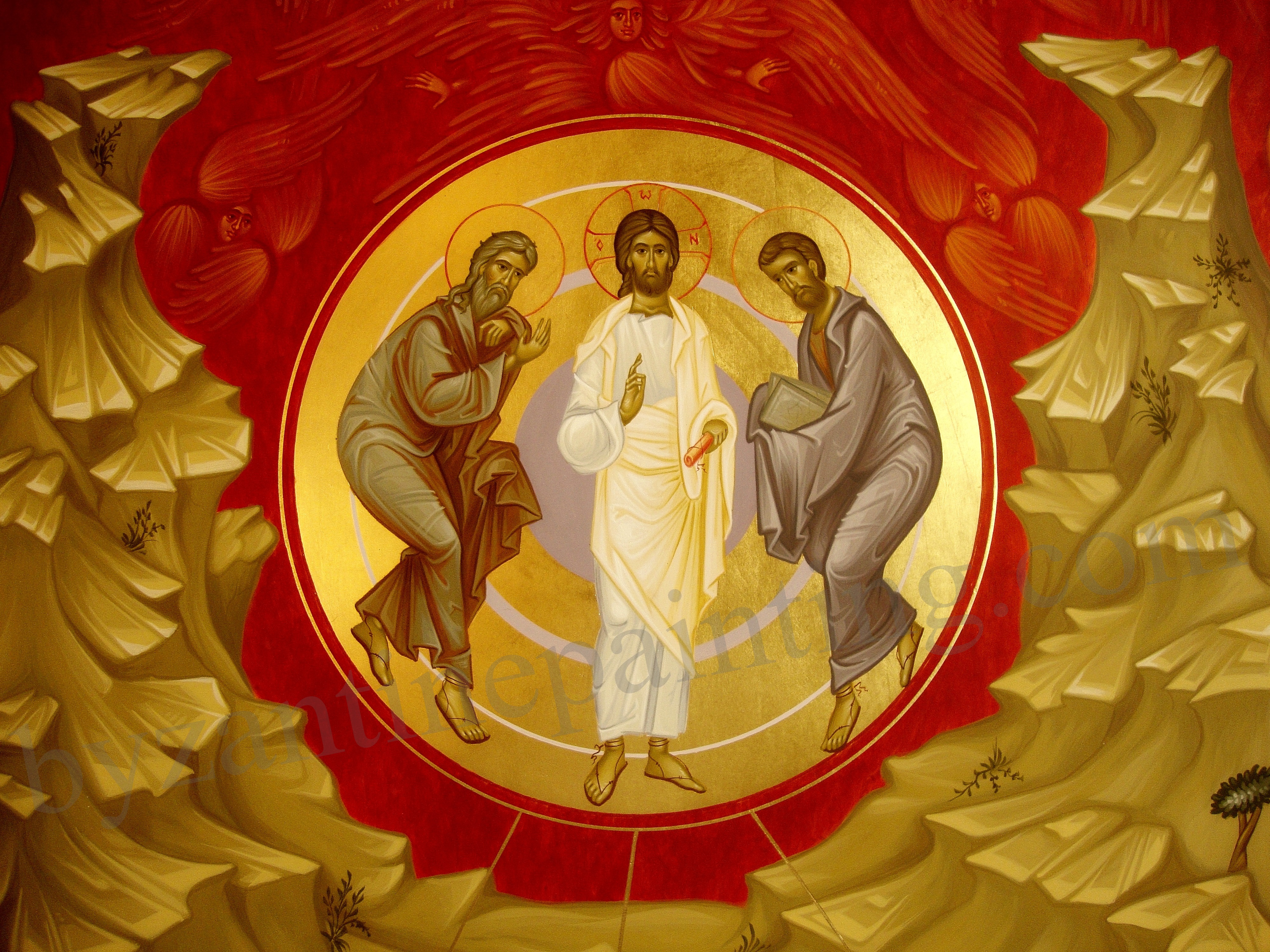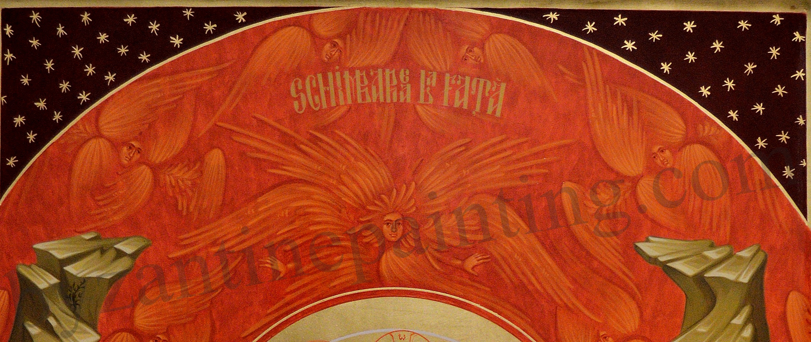 Norul luminos este reprezentat prin culoarea roșu vermilion iar în interiorul acestuia sunt dispuși pe forma cercului heruvimi si serafimi realizați în monocromie. Deasupra norului se întânlesc pe un fond roșu închis steluțe de aur simbol al lumii cerești ce urmează traseul cercurilor concentrice. Delimitarea dintre stele și nor este marcată de o linie de aur. Pe fundalul unui peisaj montan cu o structură ordonată pe arcele cercului sunt reprezentate în doua registre șase figuri. Mandorla de aur (fig. 4) alcătuiește centrul compozițional scos în evidență de contrastul pe care îl are Mântuitorul față de restul elementelor din compoziție.