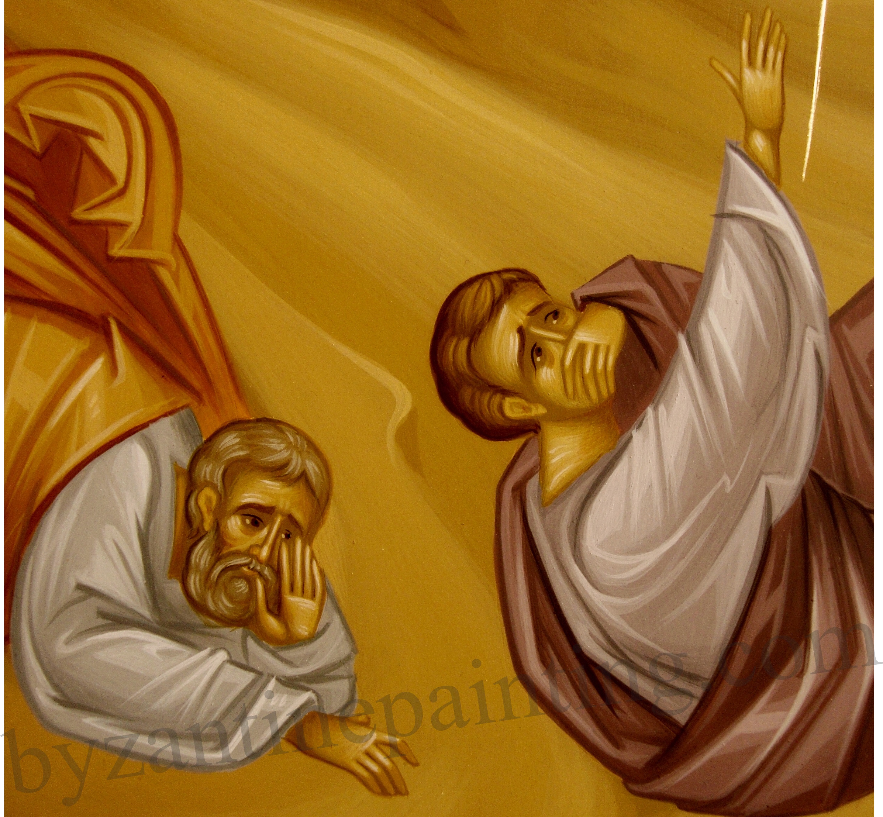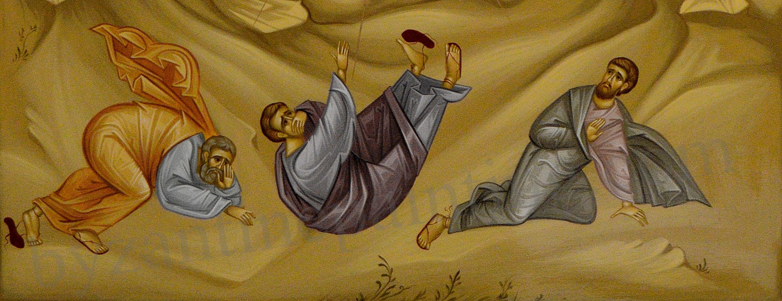 Apostolii Petru, Ioan și Iacov sunt reprezentați căzuți la pământ (fig. 7), ferindu-și sau acoperindu-și privirile la vederea Slavei Dumnezeiești. Atitudinile lor exprimă teamă, uimire și bucurie la vederea lui Hristos. În stânga icoanei se află Petru, Ioan la mijloc acoperindu-și fața dar privind spre Mântuitor (fig. 7) și Iacov în dreapta ce privește spre Mântuitor cu uimire.