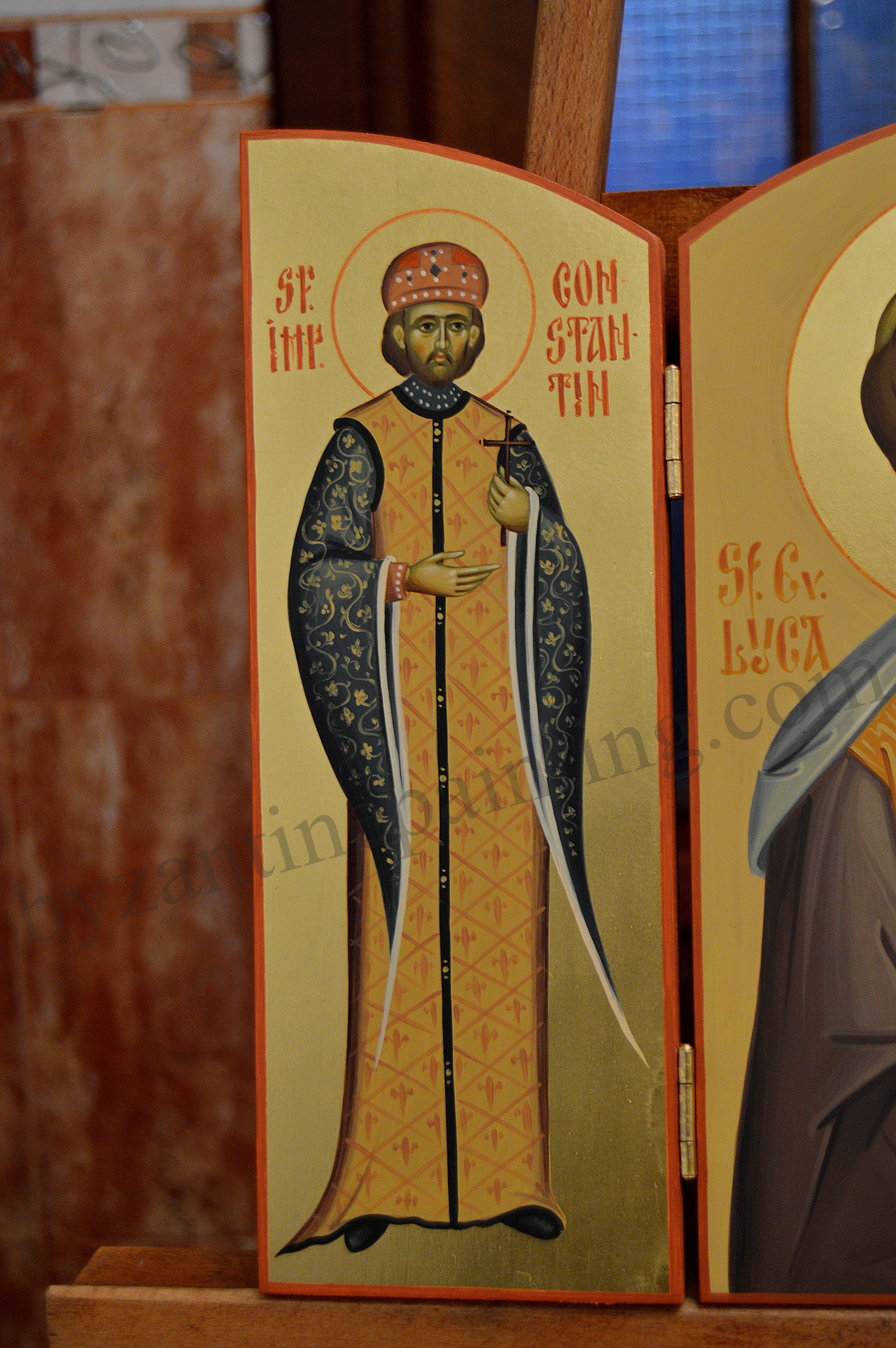În tripticul prezentat îl avem în centru pe Sfântul Luca ce ţine în mână icoana Maicii Domnului pictată, în stânga pe Sfântul Împărat Constantin cel Mare singurul dintre toţi împaraţii Romei care l-a preaslăvit pe Dumnezeu, Împăratul a toate iar in partea dreaptă a Sfântului Luca o avem reprezentată pe Sfânta Ana, maica Fecioarei Maria.